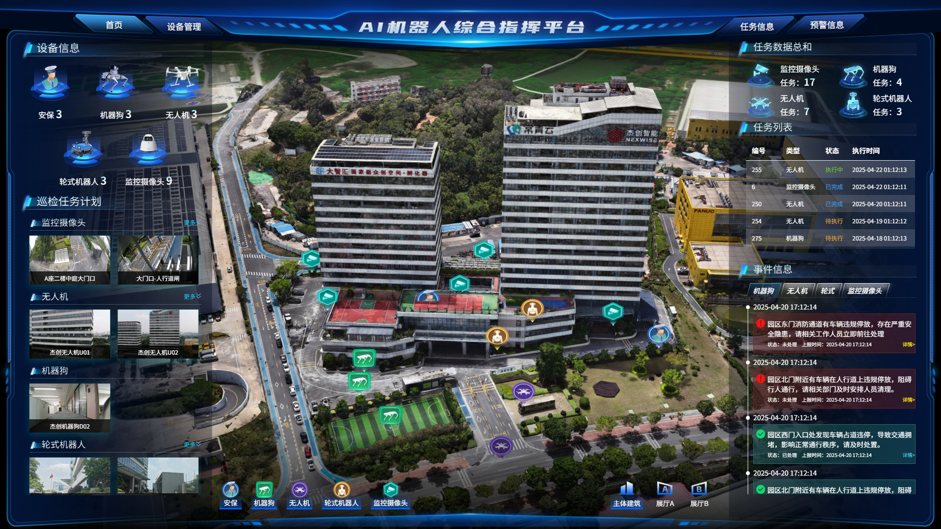 AI机器人综合指挥平台是针对重点区域智慧化安保管控推出的一体化作战指挥平台,支持对机器人、机器狗、无人机、安防摄像头等多类智能终端的统一接入和管理,对接入的智能终端可以进行自动化任务调度,实现自动巡查、自动监控、自动预警、自动网捕控制。基于平台多模态大模型实现了人员识别、车辆识别、危险行为及灾害识别等功能实现异常事件的实时预警和快速处置。该平台适用于学校:医院、院区、广场等场所,可极大提升园区安保防范能力.数字化管控能力,提高安保人员工作效率、降低工作强度、节省人力配备。